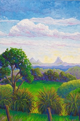 Abundant green grass and flourishing plants abound in Maleny, and are emphasized in this artwork with thick impasto brushstrokes, and vivid oil colour. Set in the Sunshine Coast hinterland, the beautiful views of the Glasshouse mountains are framed by local flora.
